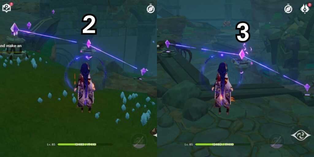 Когда вы войдете в домен, вам придется сражаться с врагами. Сначала появятся два гончих разрыва, а затем два Стража Руин. Победите их и продолжайте поиски перьев. Когда вы их найдете, перья пройдут через большую дверь. Чтобы разблокировать его, вам нужно выполнить загадку с релейным камнем. Следуйте изображению ниже, чтобы решить эту головоломку.