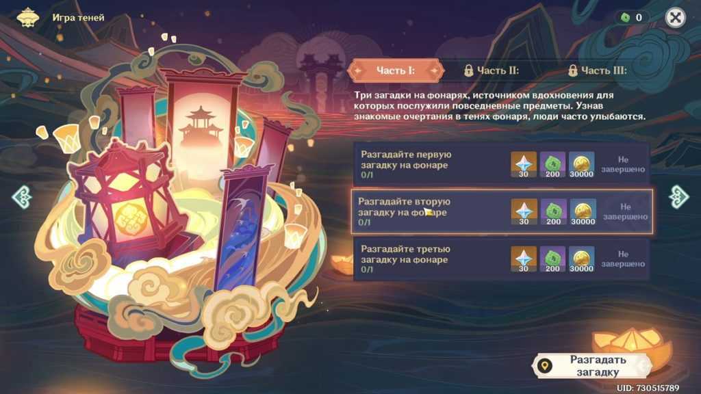 Временное событие «Краски мимолётности» возвращает «Игру теней», где нужно угадать фигуру по тени. На самом деле, это проще чем звучит или выглядит на самом деле. В порту (где уже идёт во всю подготовка к Празднику Фонарей) вас будет ждать Юань Жун, которая уже подготовила специальный Фонарь теней.