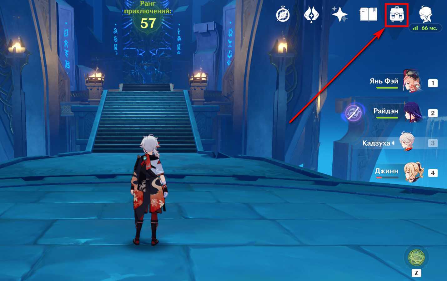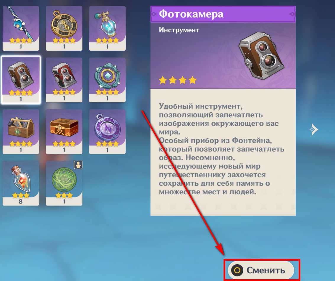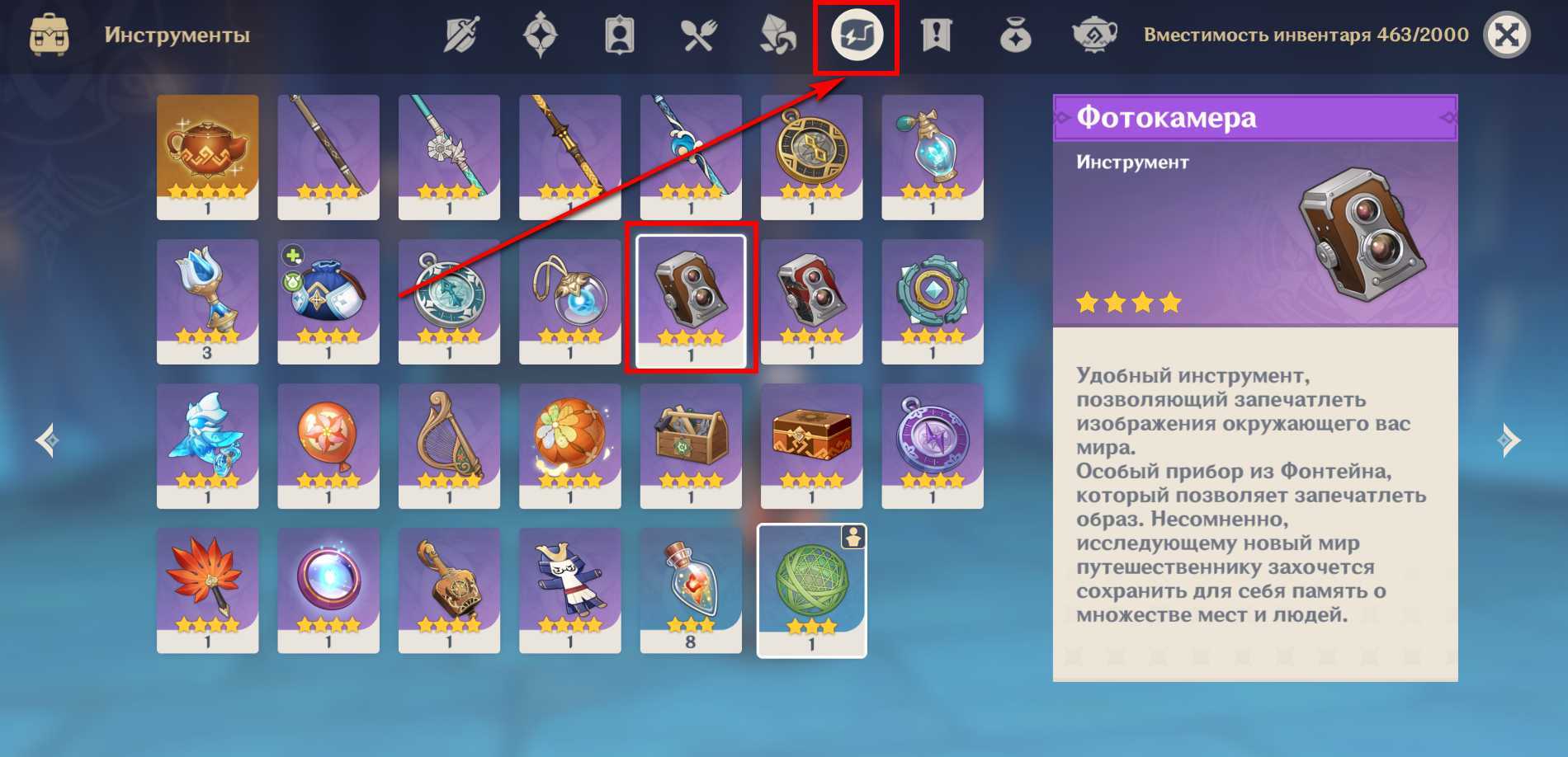 Использовать стандартный интерфейс несложно. В первую очередь встаньте там, откуда хотите сделать фото. Изменить ракурс можно будет, но минимально, поэтому точку съемки нужно выбирать заранее. Второй шаг — выход в меню Паймон. Используйте кнопку в правом верхнем углу, чтобы попасть в него.