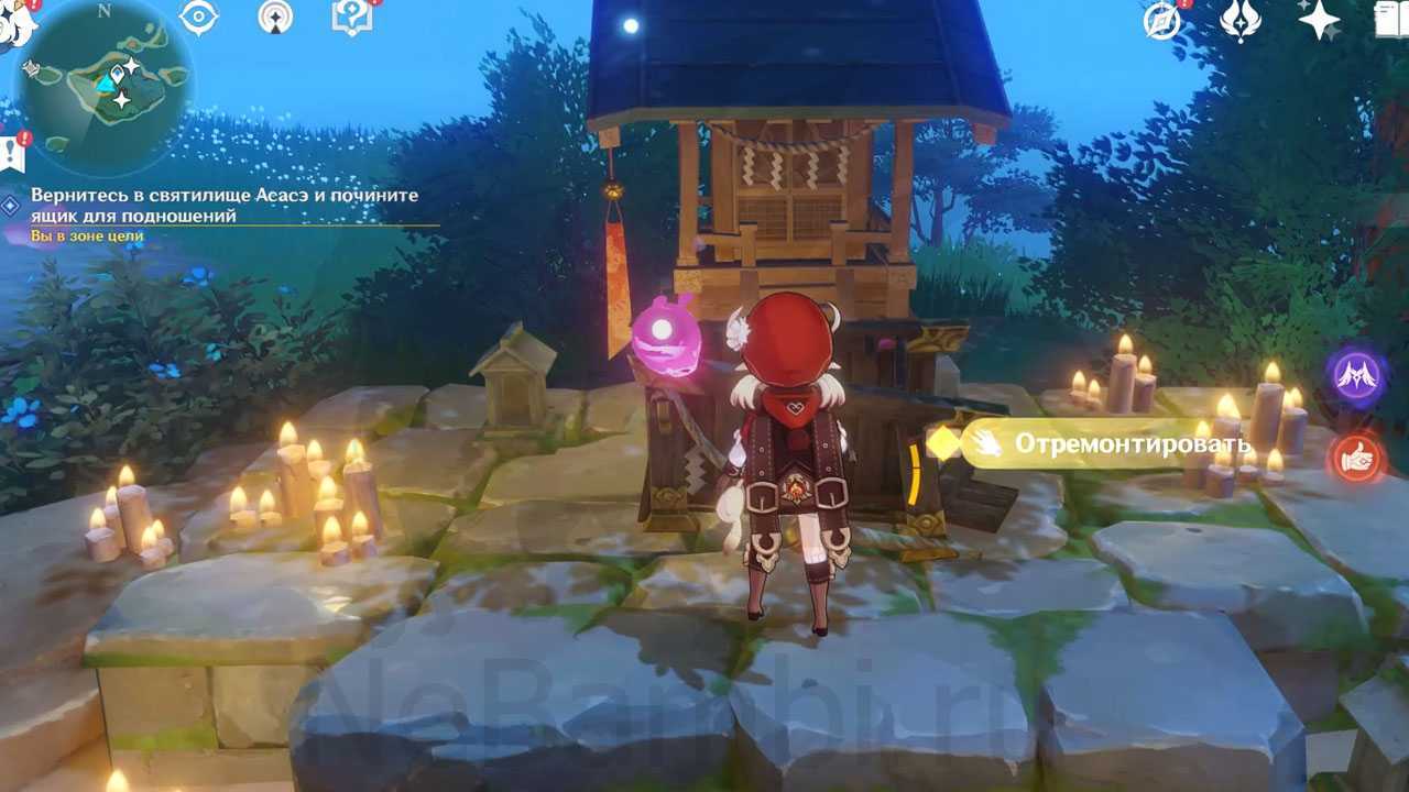 Собрав материалы, вернитесь в святилище Асасэ и почините ящик для подношений.