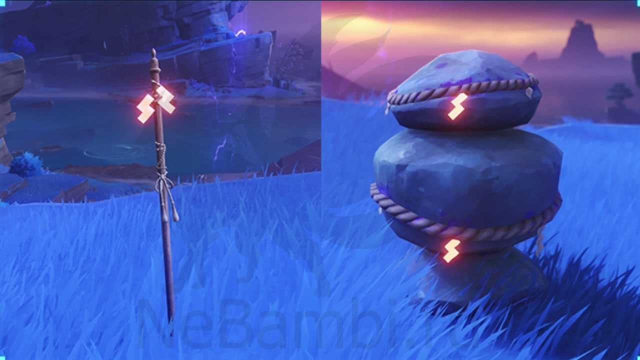 Запирающий камень будет на парящих кусочках земли, добраться до них вам помогут снова фазовые ворота, вращать их не надо просто пройдите сквозь них и долетите до конца. Приземлившись на парящую землю с фазовыми воротами в обратную сторону используйте Электрогранум Ветвей сакуры, расположенных на обрыве парящей земли тем самым вы доберетесь до камня используя Громовые сферы. С помощью Электрогранумов возле камня вы сможете добраться до столбов, чтобы прикоснуться к ним.