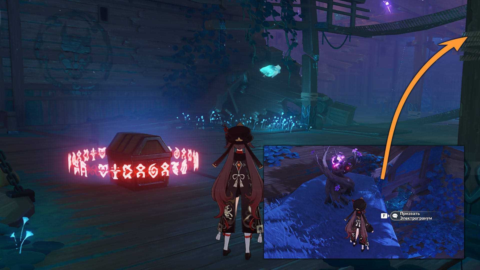 Однако и на этом приключения не заканчиваются, ведь в пещерке над сундуком есть Электро фея. Погоняйте ее по пещере и летите следом, войдя в фазовые ворота. Она активирует ту Ветвь громовой сакуры, которая ранее не работала. Очень быстро двигайтесь по громовым сферам, чтобы взмыть ввысь над кораблем и забрать электрокул.
