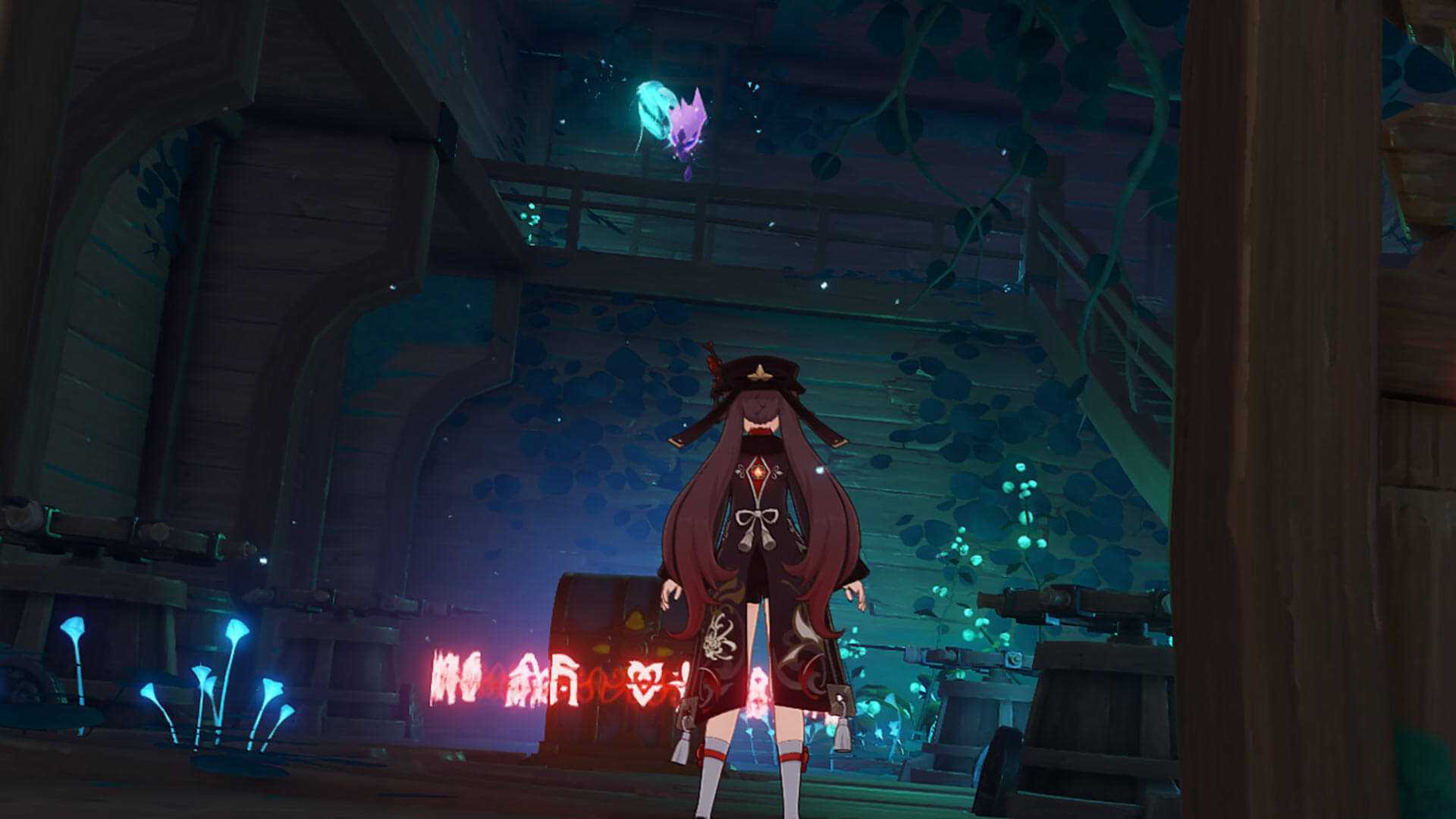 Итак, здесь проблемы две — электрическое поле, мешающее пройти в одну из частей корабля, а также непонятные панели на полу. Для начала разберемся с электрическим полем — возвращайтесь наружу, берите Электрогранум из ветвей сакуры и бегите к месту, где обвалившиеся доски образуют подъем. Пройдите через барьер, деактивируйте структуру, и проведите фею. Обыщите окружающие «блестящие точки» и сундук. В сундуке будет Ржавый Ключ, он пригодится уже совсем скоро. Доведите фею до места, где она пройдет через пол, и можно браться за решение загадки с плитами.