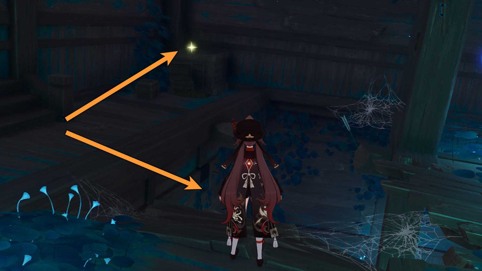 Сундук в помещении разблокируется, а доски, куда спустилась фея, разламываются, и нам открывается путь вниз. Спускаемся и продолжаем следовать за феей.