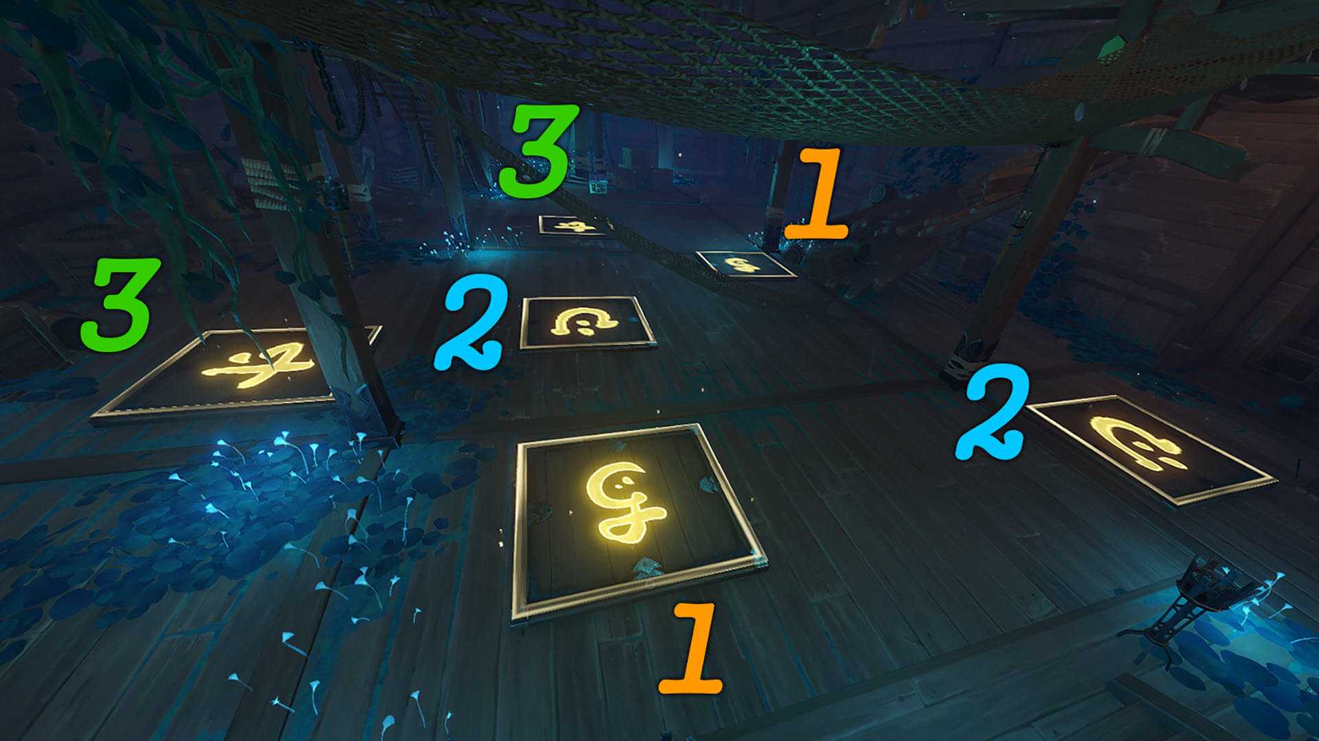 Решать загадки с плитами очень просто, это всего лишь игра на запоминание. Наступите на плиту, и на ней загорится символ. Если Вы наступите после этого на плиту с другим символом, они обе потухнут. Если на плиту с таким же символом — то обе загорятся и будут считаться «решенными». Решение показано выше.