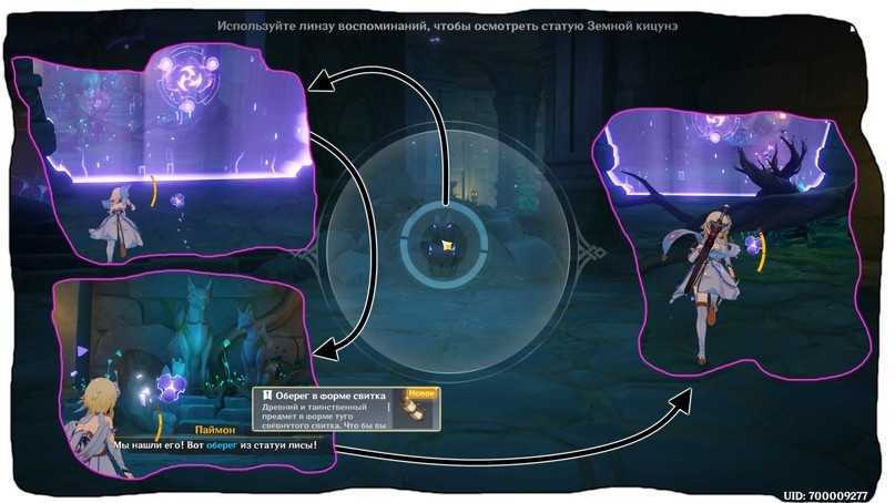 Отправляйтесь в указанную точку, посмотрите на Земную кицунэ через Линзу воспоминаний, а затем активируйте Небесную кицунэ Электро атакой. Заберите оберег в виде ключа, появившийся у ног статуи.