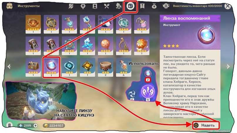 Экипируйте лину: зайдите в меню Паймон -> Инвентарь -> Инструменты, выберите линзу и нажмите кнопку «надеть»