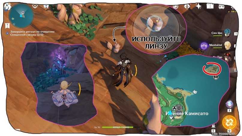Внизу используйте Ветвь громовой сакуры, чтобы пройти за барьер, где есть статуя Небесной кицунэ. Ударьте Электро навыком, чтобы активировать ее. После этого у ног статуи появится оберег для очищения.