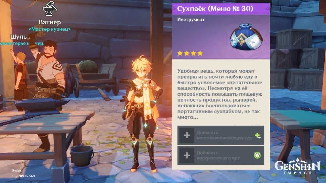 А получить Сухпаек (Меню № 30) вы сможете, достигнув 5 уровня репутации в Мондштадте. Как только в ваших руках окажется рецепт, вам останется собрать материалы для ковки — 20 хвостов ящерицы, столько же цепей хаоса, 50 электро кристаллов и 50 000 моры. Хвосты выпадают из ящериц, цепи хаоса создаются при помощи алхимии или выбиваются из монстров (стражи руин, руинные охотники и руинные молотильщики 40 и выше уровня).
