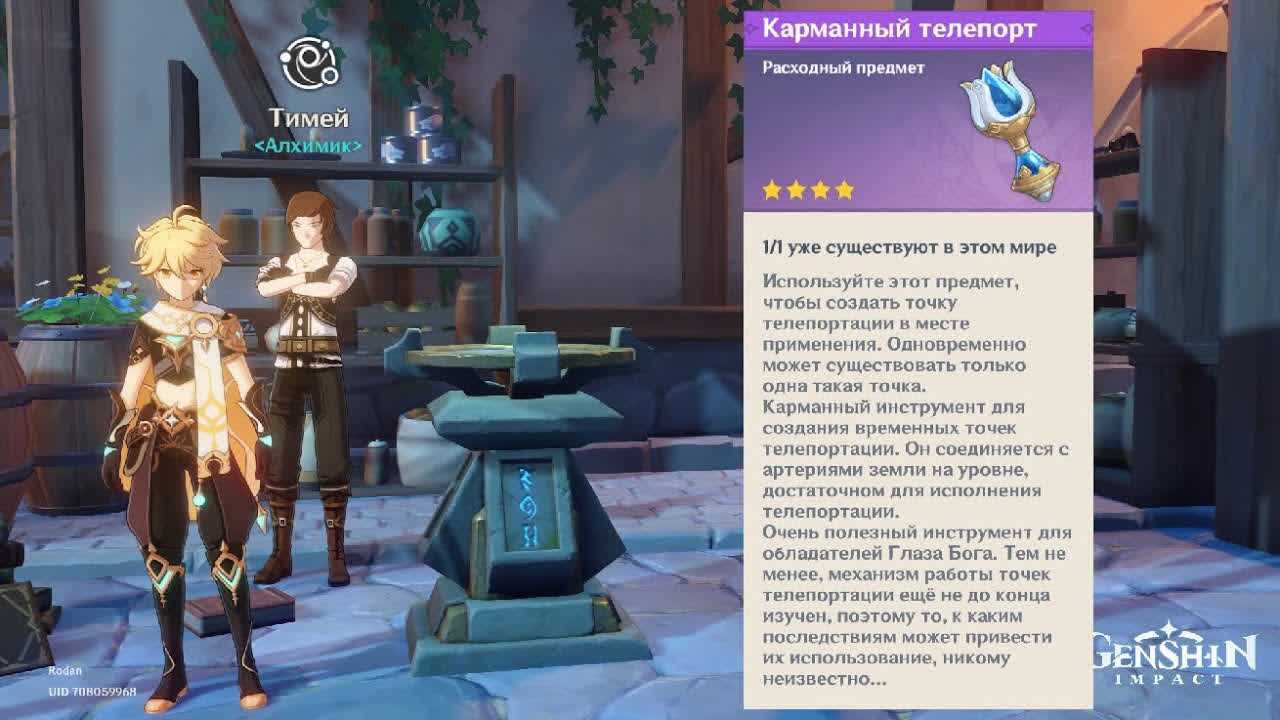 Как получить Карманный телепорт? Это одноразовый артефакт, поэтому его время от времени нужно будет создавать заново. Для этого используется алхимия. Достигнув 6 уровня репутации в Мондштадте, вы получите рецепт телепорта. Останется собрать 1 лист артерий земли, 2 светящихся брюшка, 5 осколков кристалла и 500 моры. Листья артерий выпадают из Магов Бездны 40 уровня и выше, но также их можно создать при помощи алхимии (из 3 ветвей артерий земли и 50 моры, ветви падают с любых Магов Бездны). А светящиеся брюшка выпадают из светлячков — они появляются только ночью, после 00:00.