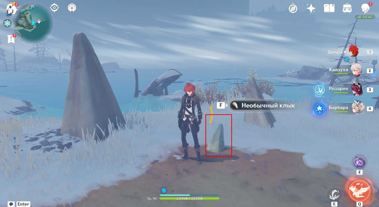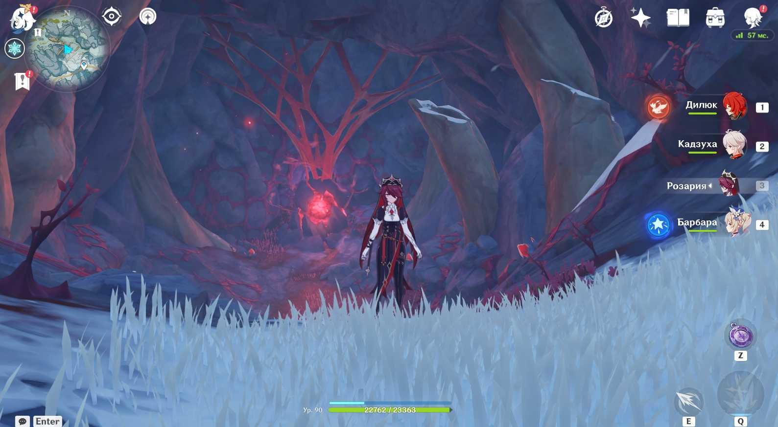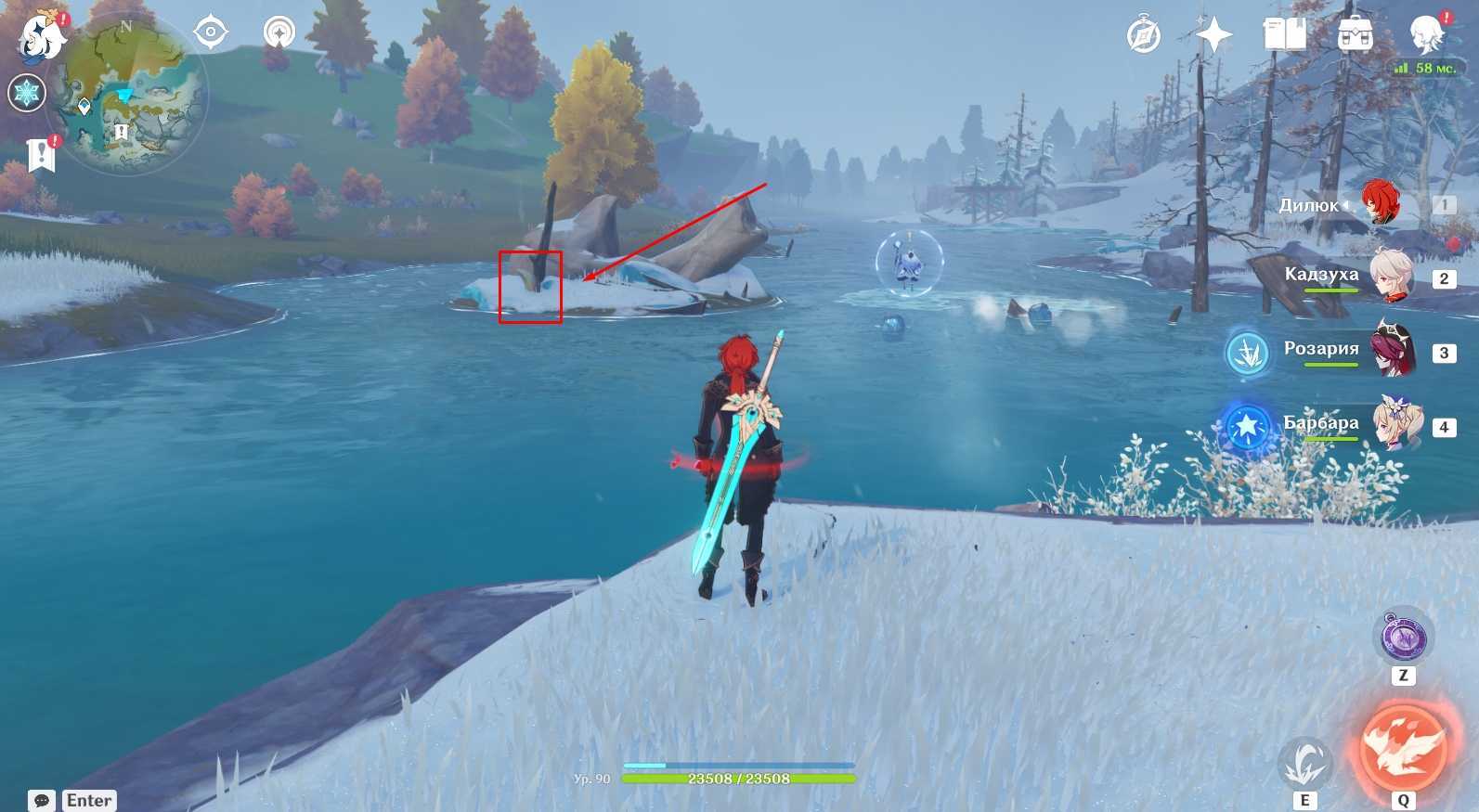 - Вторая точка — вам потребуется применение баффа «Алый кварц» для того, чтобы растопить лед. На острове будет находиться крио-маг, убивать его необязательно, ведь он замораживает воду. Это поможет вам быстрее перемещаться с острова на берег.