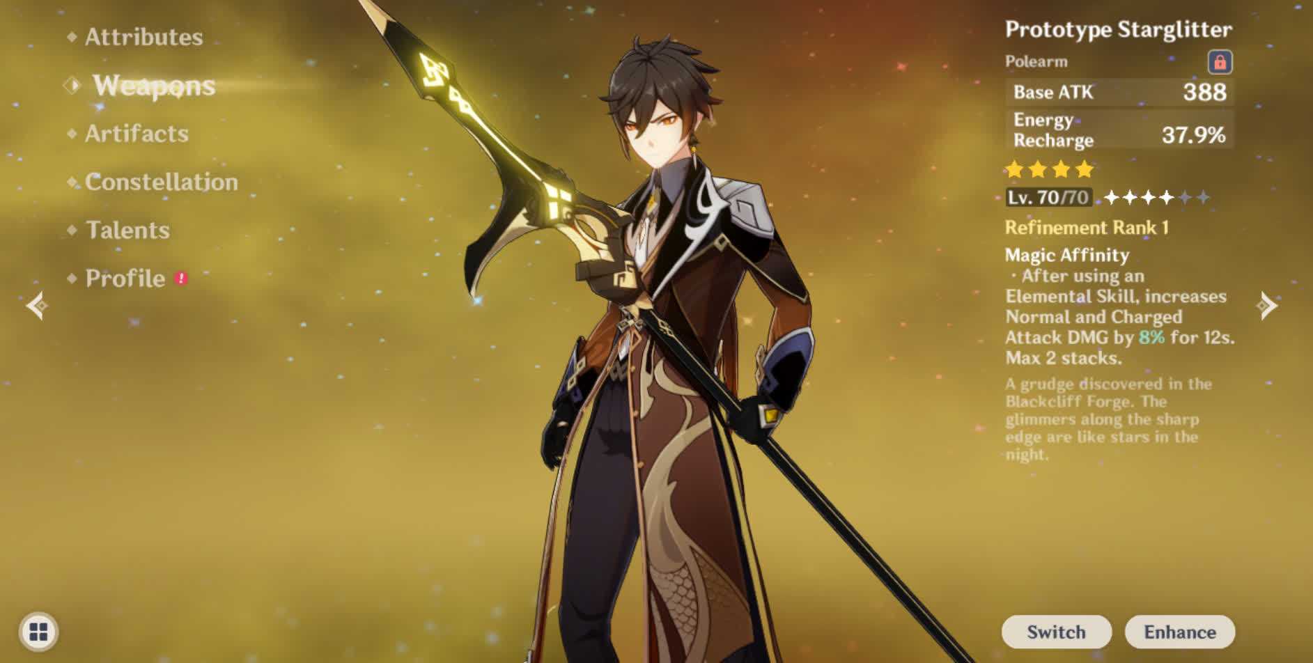 Прототип: Звездный блеск — четырехзвездочное копье с 42 единицами базовой атаки. Оно усиливает обычную и заряженную атаку на 8-16% в течение 12 секунд с возможностью складывания эффекта до 2 раз. Но возникает бонус только после использования элементального навыка.