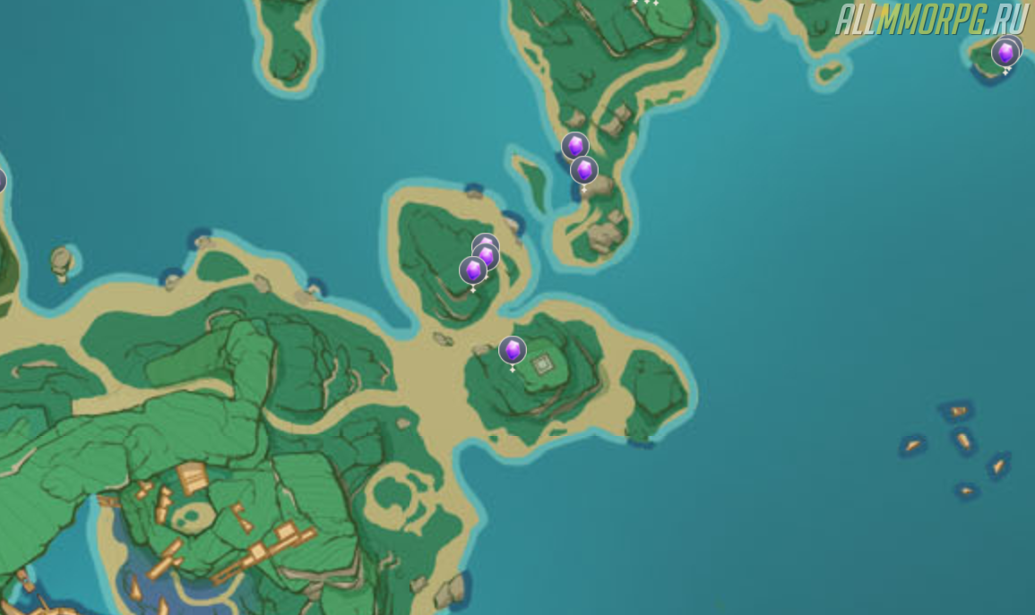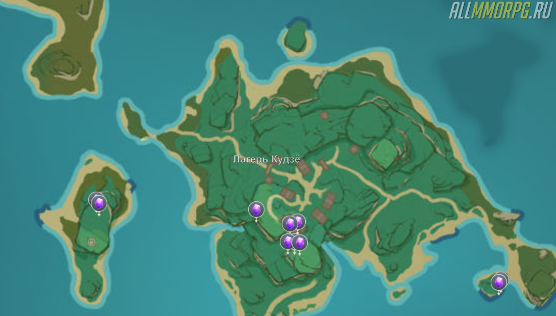 - Остров Наруками. Территория острова довольно масштабная, поэтому месторождений хватает. Куски аметиста можно встретить на каждом шагу, если хорошо приглядеться. Самыми актуальными зонами считаются: побережье, деревня Конда и Арунами. Не стоит обходить мимо и маленькие острова рядом с Инадзумой.