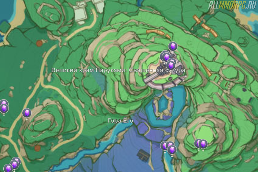 Гора Ёго и Великий храм Наруками – место, которое играет важную роль в жизни Инадзумы. Там Путешественник найдет Священную сакуру и, конечно же, куски аметиста. В этой зоне есть примерно 10-13 точек спавна руды. Чаще всего они находятся рядом с водоемами и на выступах. Начинайте свой маршрут с подножия горы и собирайте ресурсы по мере продвижения вверх.