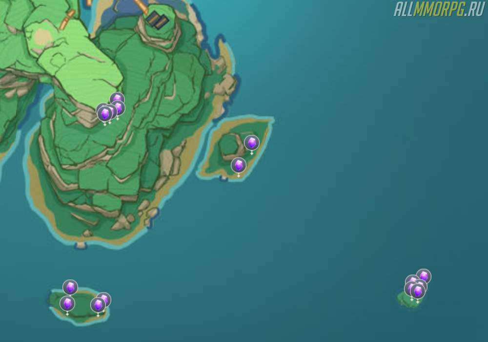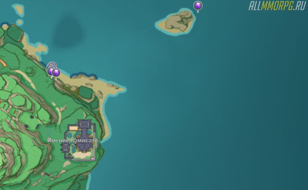 Телепортируйтесь к имению Камисато и направляйтесь в сторону побережья. По пути вы соберете около 5-6 кусков аметиста. Часть из них находится на берегу Наруками, а другие – на мелких островах напротив береговой линии.