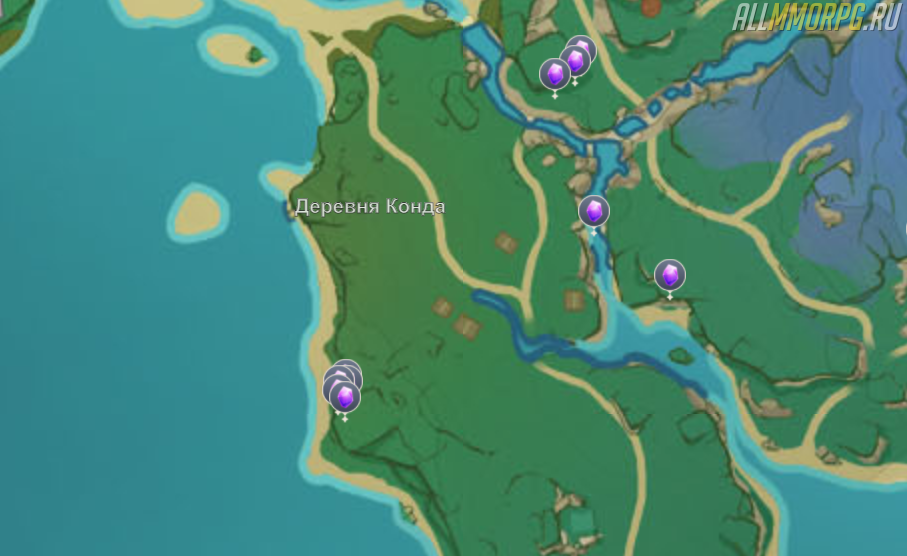 Также имеются крупные месторождения к югу (на побережье) и северо-востоку от деревни Конда, а также к западу от леса Тиндзю и к западу от поместья Камисато на возвышенностях. На следующем рисунке показаны все эти места.