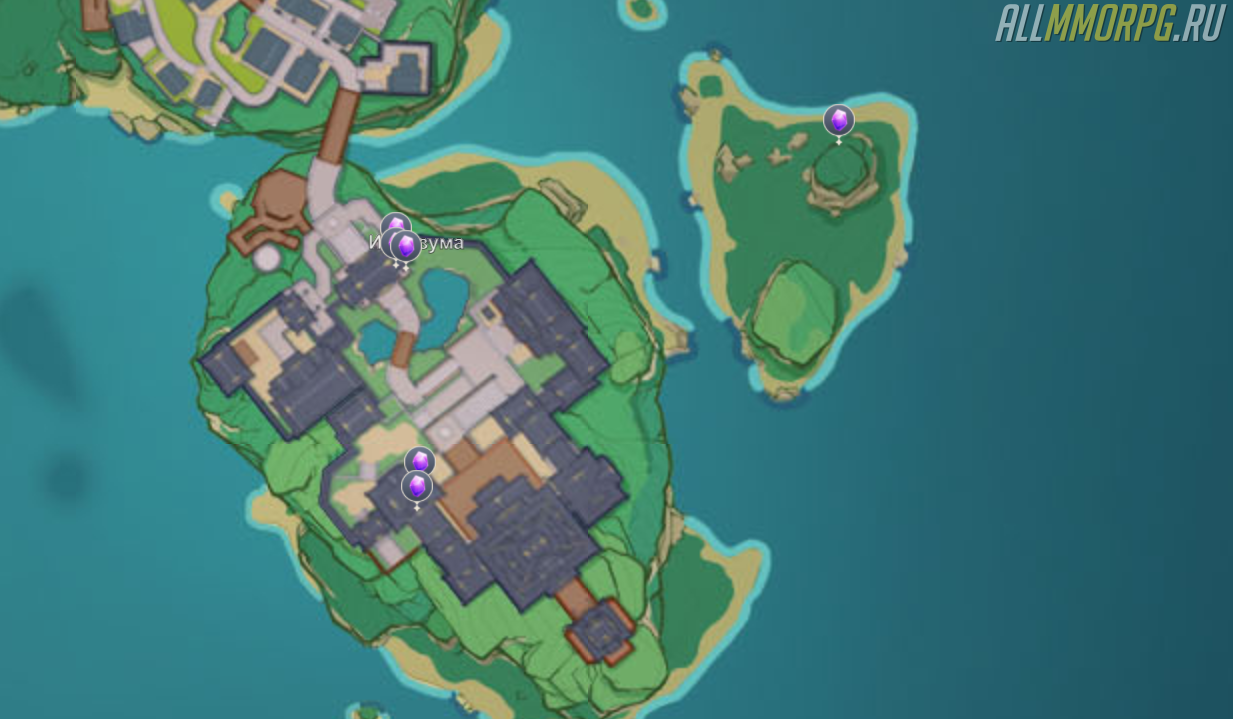 Последнее место, где можно насобирать куски аметиста – столица региона Инадзума. К сожалению, там вы не найдете столько руды, сколько есть в Татарасуне, однако, учитывая, что вы бываете там довольно часто, это неплохой вариант для пополнения своих запасов материалов для крафта оружия.