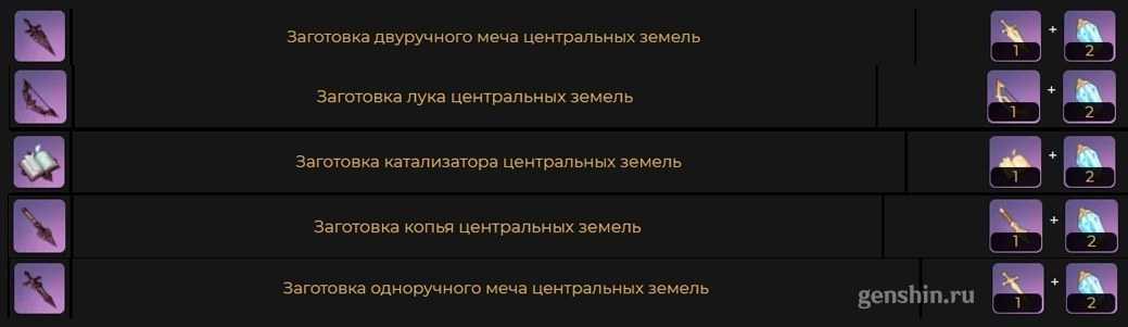 Для чего нужна Заготовки центральных земель в Genshin Impact? Для большинства опытных игроков или же игроков, которые переступили порог в 20-30 рангов ответ на этот вопрос очевиден, но уделим внимание новичкам. Заготовки центральных земель пригодятся вам для того, чтобы скрафтить новое бесплатное оружие из Сумеру: