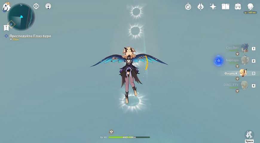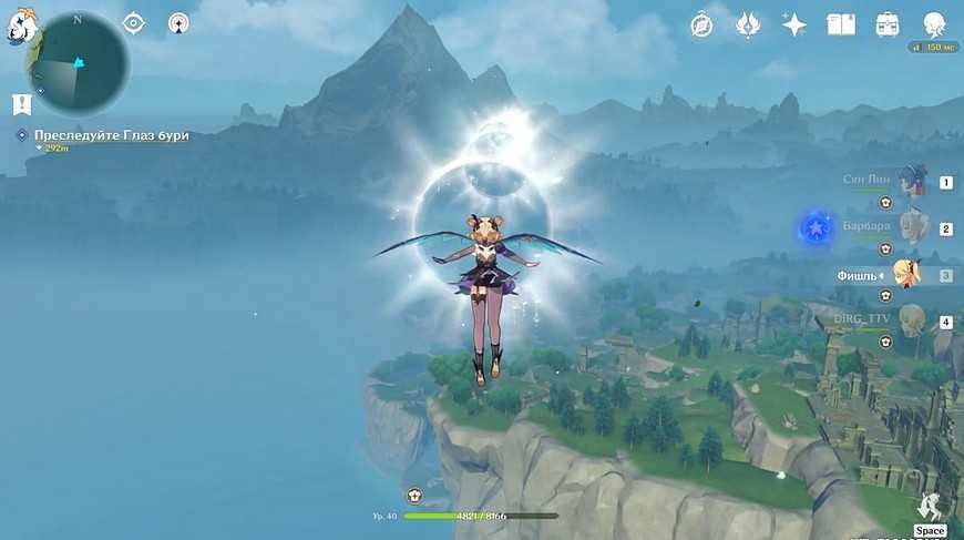 Дальше просто направляем персонажа, чтобы он не вылетал за пределы колец. Таким образом, оказываем в области Храма тысячи ветров в Мондштадте. Наконец, опускаемся на землю, там куда подсказывает квест «Время и ветер».