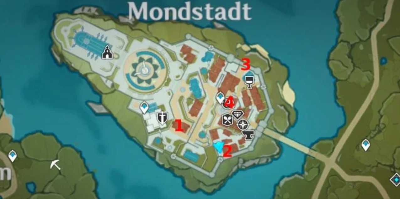 В Мондштадте есть четыре плаката и таблицы объявлений, которые необходимо собрать для этой миссии. Для каждого из четырех мест вы можете обратиться к карте Мондстадта, приведенной ниже. Рекомендуется телепортироваться к западному телепорту на вершине штаб-квартиры Ордена Фабониуса и пройти налево вокруг Мондштадта.