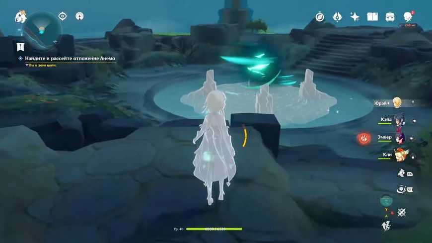 Входим в ветряной барьер и применяем вновь чувство стихий , чтобы увидеть в центре огромное отложение анемо. Прежде чем вновь использовать анемо-способности для рассеивания, обязательно подготовьте команду для боя.