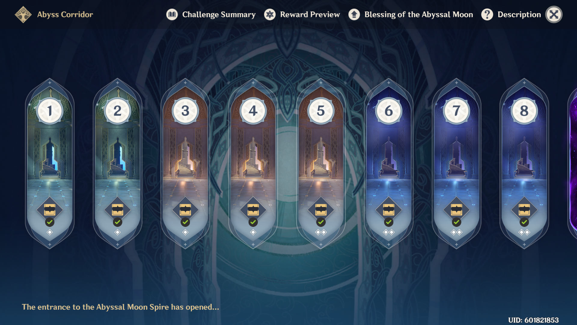 Первые 8 этажей составляют Коридор Бездны. Эти уровни доступны всегда, а награды можно получить только один раз. Эти этажи также никогда не изменятся.