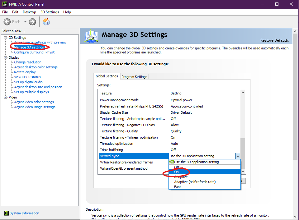 - Vsync: You can enable Vysnc to limit your game to the HZ that your monitor is set to. This can reduce screen tearing in game, and also limit the additional FPS so that you use less processing power trying to reach the highest frames possible for your settings, some of which your monitor might not even offer.