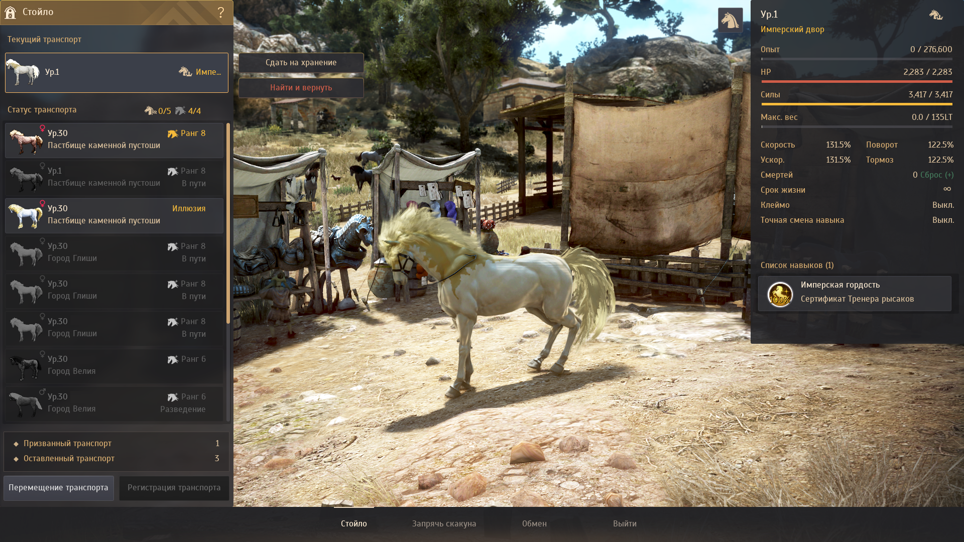 Подробнее об имперских лошадях- Имперские лошади рождаются с навыком «Имперская гордость», однако не могут изучить другие навыки.- Имперскую лошадь нельзя обменять, зарегистрировать в меню разведения или ярмарки.- Вероятность получить имперскую лошадь возрастает, если при скрещивании используются конь и лошадь высоких рангов и уровней.* Уровень оказывает влияние на вероятность получения имперской лошади, только когда не он не превышает 30. Начиная с 31-го уровня, вероятность получить имперскую лошадь такая же, как и при скрещивании лошадей 30-го.- Уровень укрощения и мастерство не влияют на вероятность получения имперской лошади.- Имперскую лошадь можно получить только с помощью скрещивания. С помощью обмена этого сделать нельзя.- Для имперской лошади нельзя использовать следующие предметы: Клеймо для транспорта, Смена навыка транспорта, Купон на получение навыка транспорта, Изучение навыка транспорта, Купон на изучение всех навыков транспорта, Купон на изменение внешнего вида лошади, Премиум-купон на изменение внешнего вида лошади, Сброс развития транспорта и Смена имени транспорта.