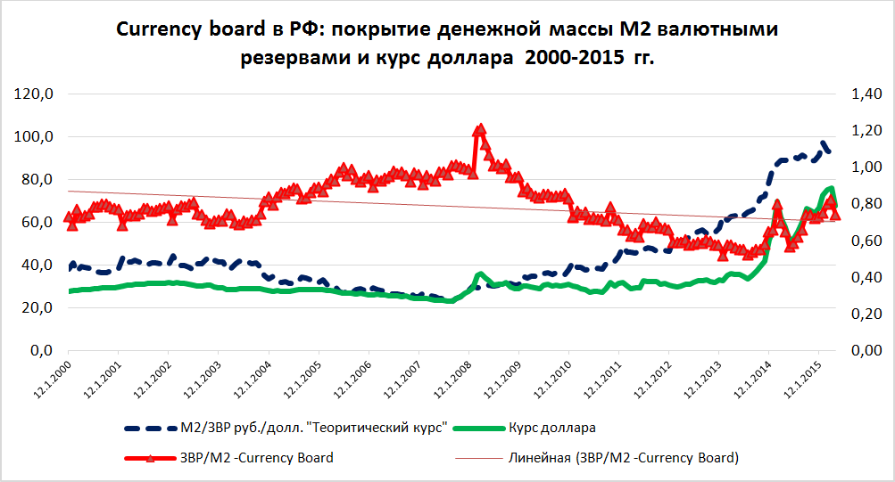 Сказанное иллюстрируется следующим рисунком (Сurrency board в РФ): где – синим цветом (пунктир) дано отношение денежной массы М2 к объему ЗВР – рубль/доллар – «теоретический курс доллара»; зеленым – реальный курс доллара к рублю – рубль/доллар; красным цветом – уровень покрытие рублей долларом (currency board) и представлен его линейный тренд.