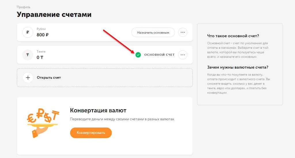 Далее заходим в настройки профиля, переходим в «Счёт по умолчанию», нажимаем на «Сменить» и создаём счёт в тенге.