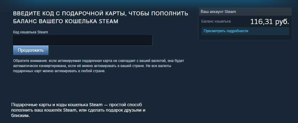 Присваивается новый код с помощью кнопки «Продолжить». Перед пополнением счета Steam периодически запрашивает дополнительные подробности – адрес и предпочитаемую валюту (конвертация происходит в автоматическом режиме). Информация о текущем балансе (после активации) появится в правой верхней части интерфейса.