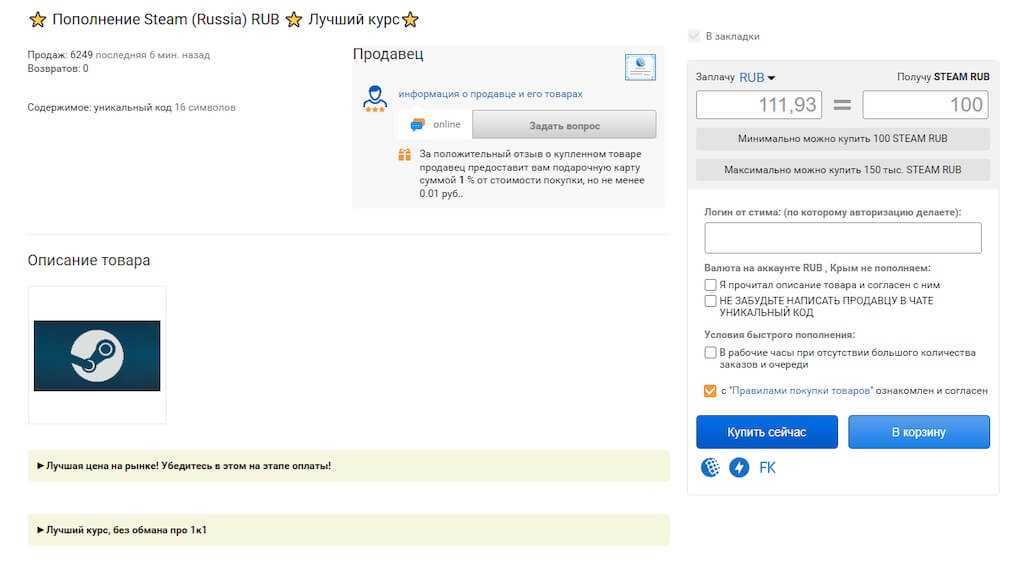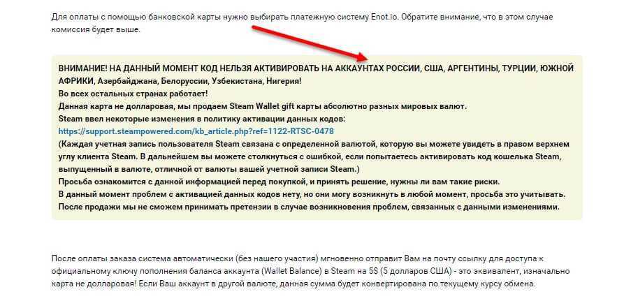 Найти в поисковой выдаче наборы для стран СНГ сложно – из-за быстро меняющегося курса и новых правил, действующих в Steam и ограничивающих продажу карт для некоторых регионов, далеко не все продавцы рискуют связываться с Россией или Белорусией. А потому перед проведением хоть каких-то платежей не помешает заглянуть в карточку приобретаемого товара. Кроме стоимости, действующей комиссии и поддерживаемых систем оплаты (банковские карты, платежные сервисы), в описании появится и информация о странах, принимающих или отклоняющих подарочные карты.