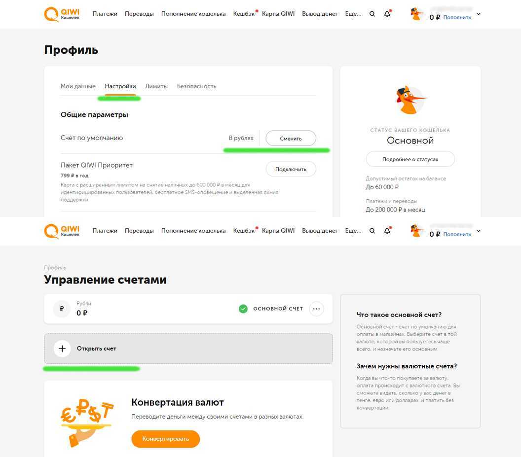 Начать стоит с регистрации нового кошелька на официальном сайте Qiwi с помощью номера мобильного телефона. После подготовленный счет предстоит пополнить (наиболее выгодный вариант – с помощью системы быстрых платежей) и подготовить к работе со сторонними валютами. Речь об уже названных раннее тенге, добавляемых в профиль через раздел «Управление счетами».