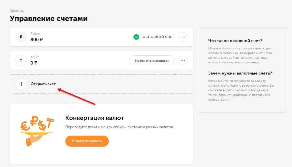 - Создаёте новый счёт. Для этого нажимаете на свой номер телефона и во всплывающем окне нажимаете «Открыть новый счет». На появившейся странице нажимаете «Открыть счёт» и выбираете валюту «Тенге» (Казахстан).