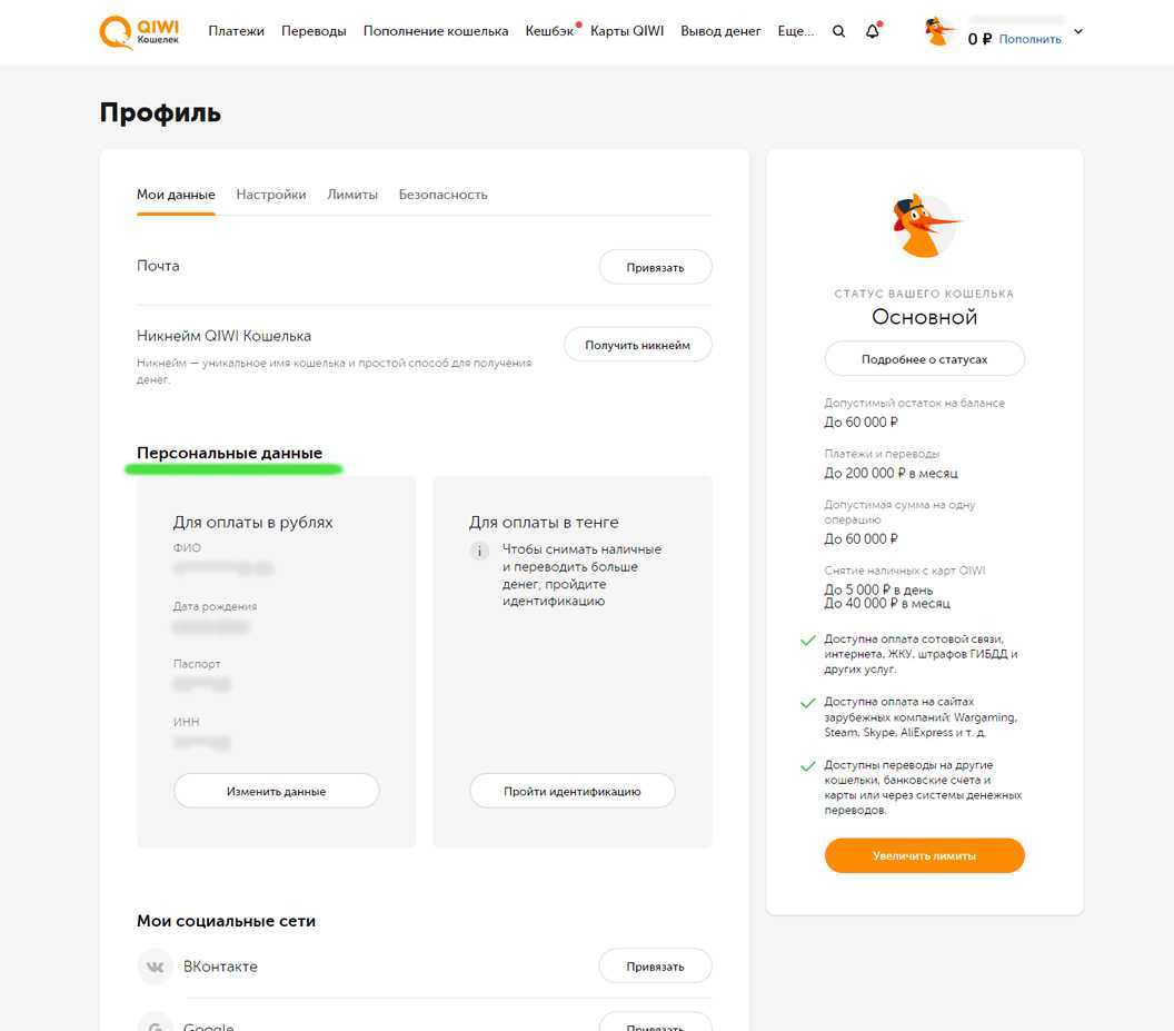 - После прохождения идентификации и получения статуса «Основной», пополняете ваш счёт Qiwi любым из предложенных способов.
