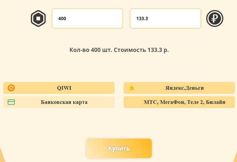 Далее откроется форма оплаты. В поле «Получу» введите нужное количество робуксов, после чего справа отобразится сумма в рублях, которую нужно будет оплатить ваши робуксы;