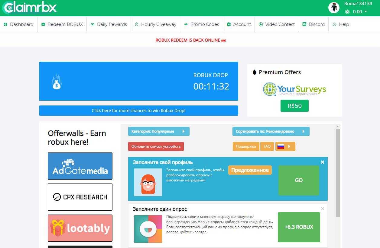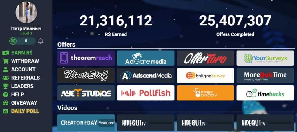 В отличие от двух первых ресурсов, заданий тут меньше. Зато есть разные бонусы и ежедневная раздача. Удобно, что баланс ведется в R$ и минимальный порог для вывода всего 10 Robux. Пользователи этого сайта уже вывели с него свыше 62 миллионов робуксов. Есть система уровней, за выполнение квестов начисляются бонусы.