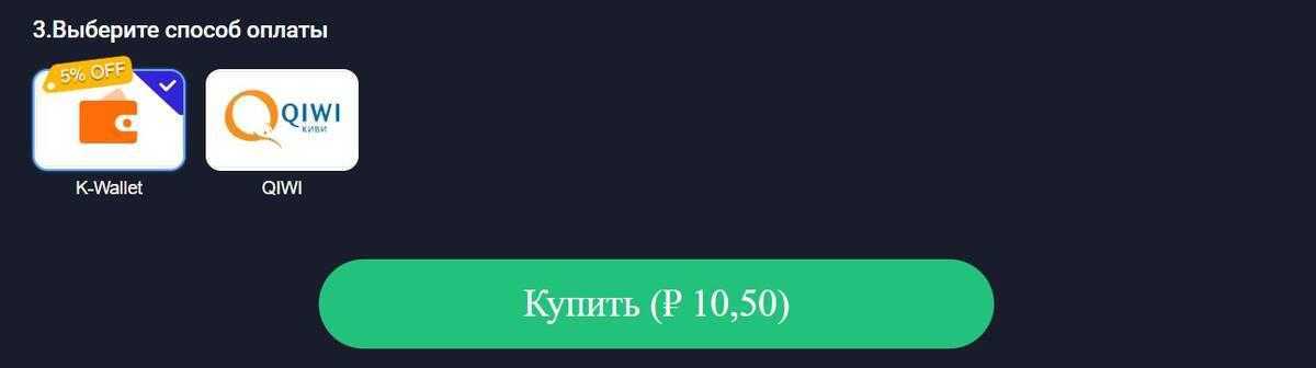 5. В качестве метода оплаты выберите K-Wallet или другой метод оплаты и нажмите на зеленую кнопку с надписью «Купить».