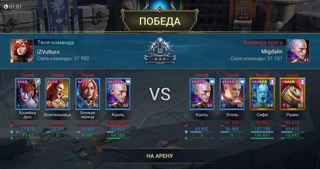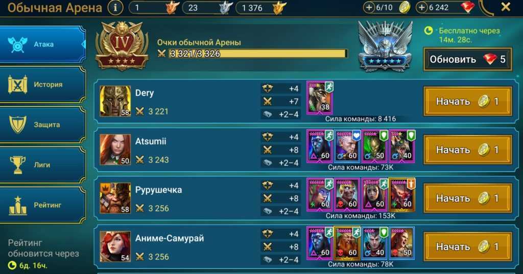 Подбор соперников на арене зависит от силы вашего аккаунта. Правило работает до золота. Это значит, что если у вас не будет кучи прокачанных и одетых героев, то и противники будут попадаться слабые