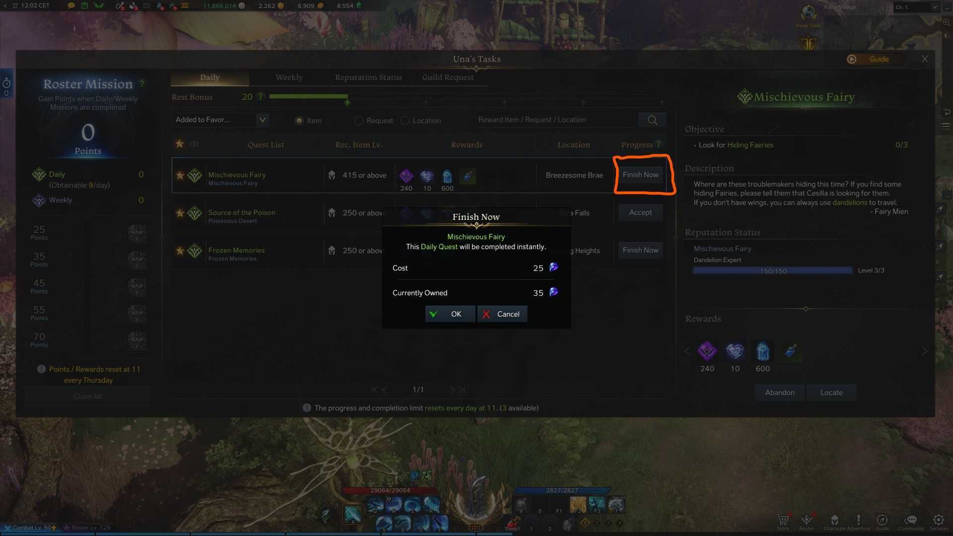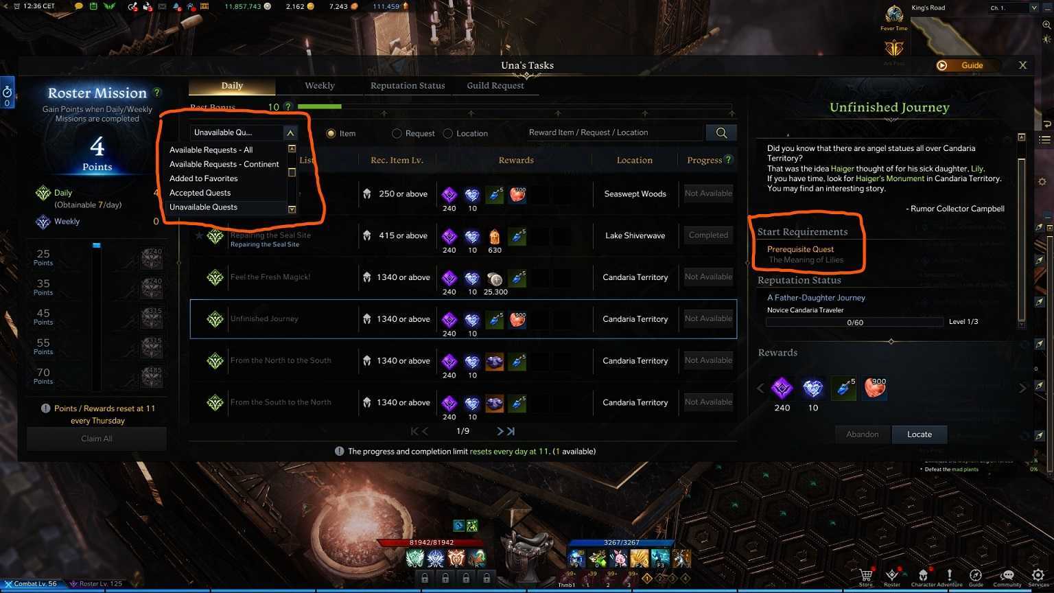 Задачи Уны — это система ежедневных и еженедельных квестов. который разблокируется после достижения 50-го уровня. Вы можете получить доступ к своим задачам, нажав «Приключение» в правом нижнем углу экрана и выбрав «Задачи Уны» вариант. Вы также можете получить доступ к этому меню, нажав Alt + J.