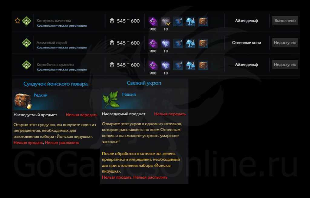 Чтобы получить каждый из ингредиентов вам нужно делать еженедневный квест Эфонского союза «Контроль качества». Как сделаете его 3 раза, вам станет доступно задание «Алмазный скраб», за него тоже дают сундук. Следующий после него квест – «Коробочки красоты», они тоже с сундуком.