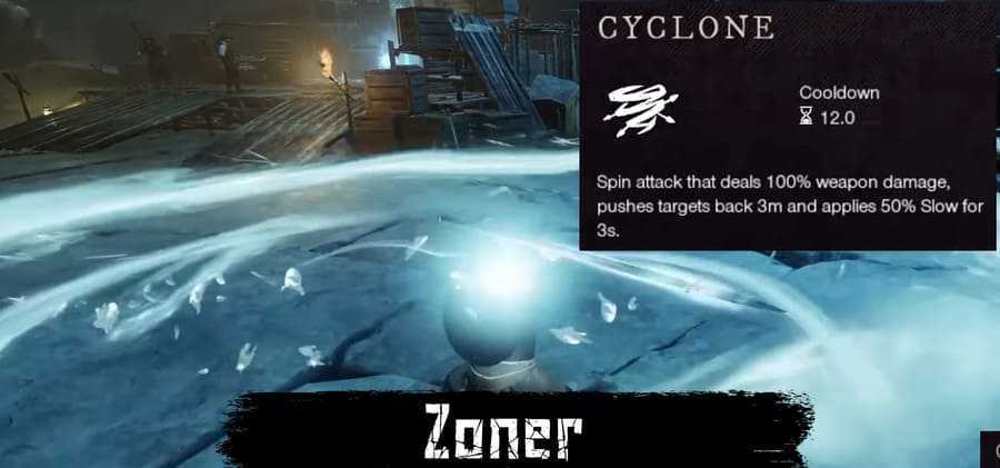 Это атака, совершаемая по кругу с силой 110% от дамага оружия. Отбрасывает противников на три метра назад и вешает дебаф замедления на 50% в течение трех секунд. Усиливающие спецнавыки скилла: