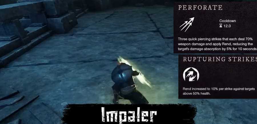 Если у вас мало патронов или ваша цель сократила расстояние, пора переключиться на копье из дерева Импалера. Skewer и Perforate — отличные умения для открытия, поскольку они значительно увеличивают ваш урон со временем благодаря эффектам Bleed и Rend. Vault Kick наносит не самый большой урон, но его Empower и сокращение времени действия — обязательные атрибуты.