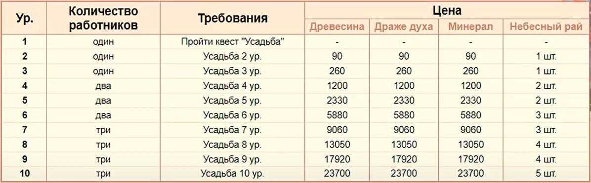 Здесь всё вполне логично: чтобы усадьба развивалась игроку следует её улучшать. Реализовать задуманное можно, если нажмёте на кнопку «Постройки». У каждого улучшения есть своё требование и собственная цена. Поэтому предлагаем быстро рассмотреть каждую постройку: