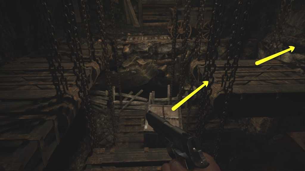 Поезжайте вверх по реке.и остановитесь у похожего раздвижного моста. Здесь вы найдете вход в крипту. Вам нужно решить головоломку с факелами. Используйте подвесной факел и зажгите два рядом стоящий факела. Когда начнут появляться монстры, сделайте так, чтобы один из монстров подошел к подвесному факелу и воспламенился. Заманите его к факелу в соседней комнате, чтобы получить ценный предмет «Золотая статуя госпожи», а также патроны для револьвера.