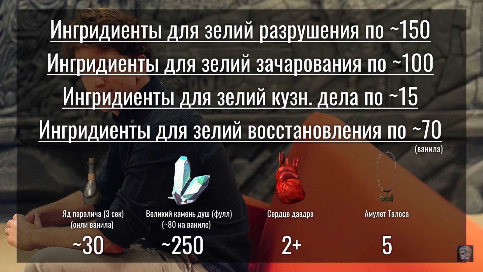 Зачарование – пожалуй, самая имбалансная функция во всех частях TES, начиная с Morrowind. А если смешать ее со скайримской алхимией – можно получить совсем неприличные баффы. Например, зелья и зачарования на 35 тысяч к урону или любому навыку Для этого нам и нужен был «некромаг», ведь с ним персонаж получает дополнительные +25% к любому их этих показателей.