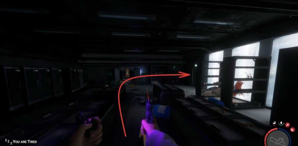 Продолжайте идти прямо, пока не дойдете до области с множеством мутантов и источником света, указывающим путь направо. Затем поверните налево у ряда оранжевых курток. Если вы продолжите идти прямо, вы попадете в комнату с большим водоемом, в котором находится акула. Ребризер находится в конце этой комнаты.