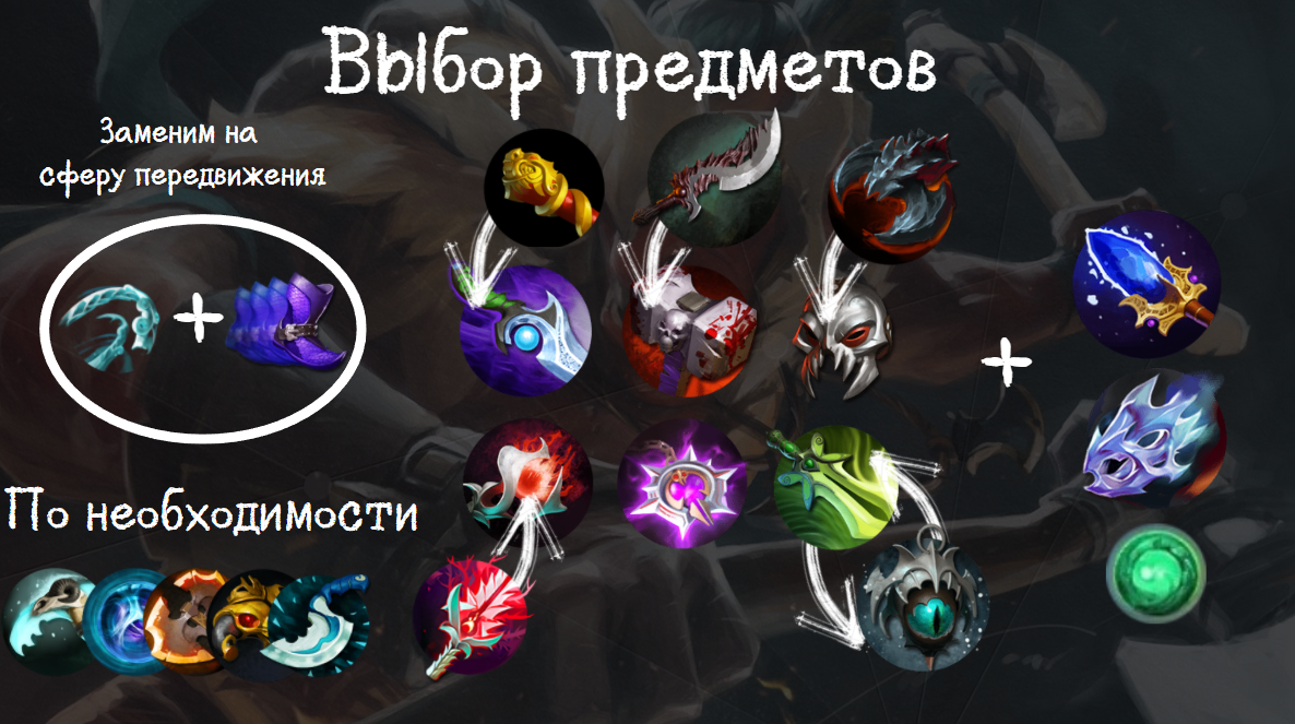 Так как мы выбрали только одну стезю изучения легендарного навыка, то и предметы не будут сильно отличаться в зависимости от вражеских героев. Надо учитывать, что многие предметы вам придется продавать в поздних стадиях игры и заменять другими (особенно перед дуэлью). В схеме я отражу основные предметы в последовательности приобретения и дальнейшей их заменой на другие.