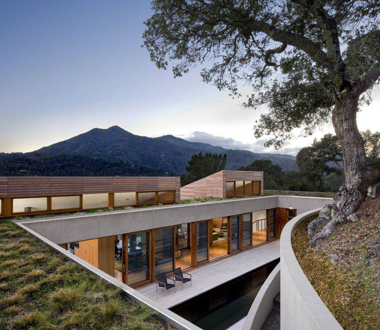 Они спроектировали изогнутую стену, которая повторяет контуры холма и прикрепляет дом к крутому участку. Зеленая крыша позволяет зданию гармонировать и лучше общаться с ландшафтом. Проект был завершен в 2010 году и был разработан с использованием устойчивых и экологически чистых функций, таких как зеленая крыша, солнечные панели, пассивные системы отопления и охлаждения и другие подобные функции, призванные подчеркнуть тесную связь дома с красивой землей, окружающей его.