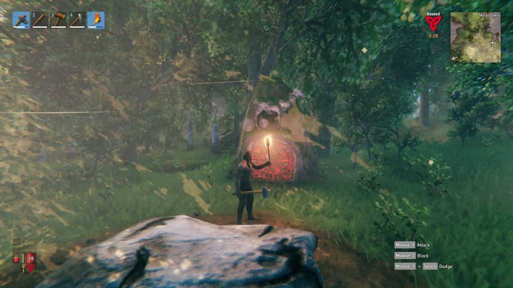 В процессе исследования биома вы найдете кучу полуразрушенных строений. Мы рекомендуем тщательно исследовать каждое из них, чтобы найти различные предметы, представляющие огромную ценность на начальном этапе игры. Также по локации разбросаны рунные камни. При взаимодействии с ними игрок может прочитать кусочек ЛОР-а Valheim или получить полезные подсказки.